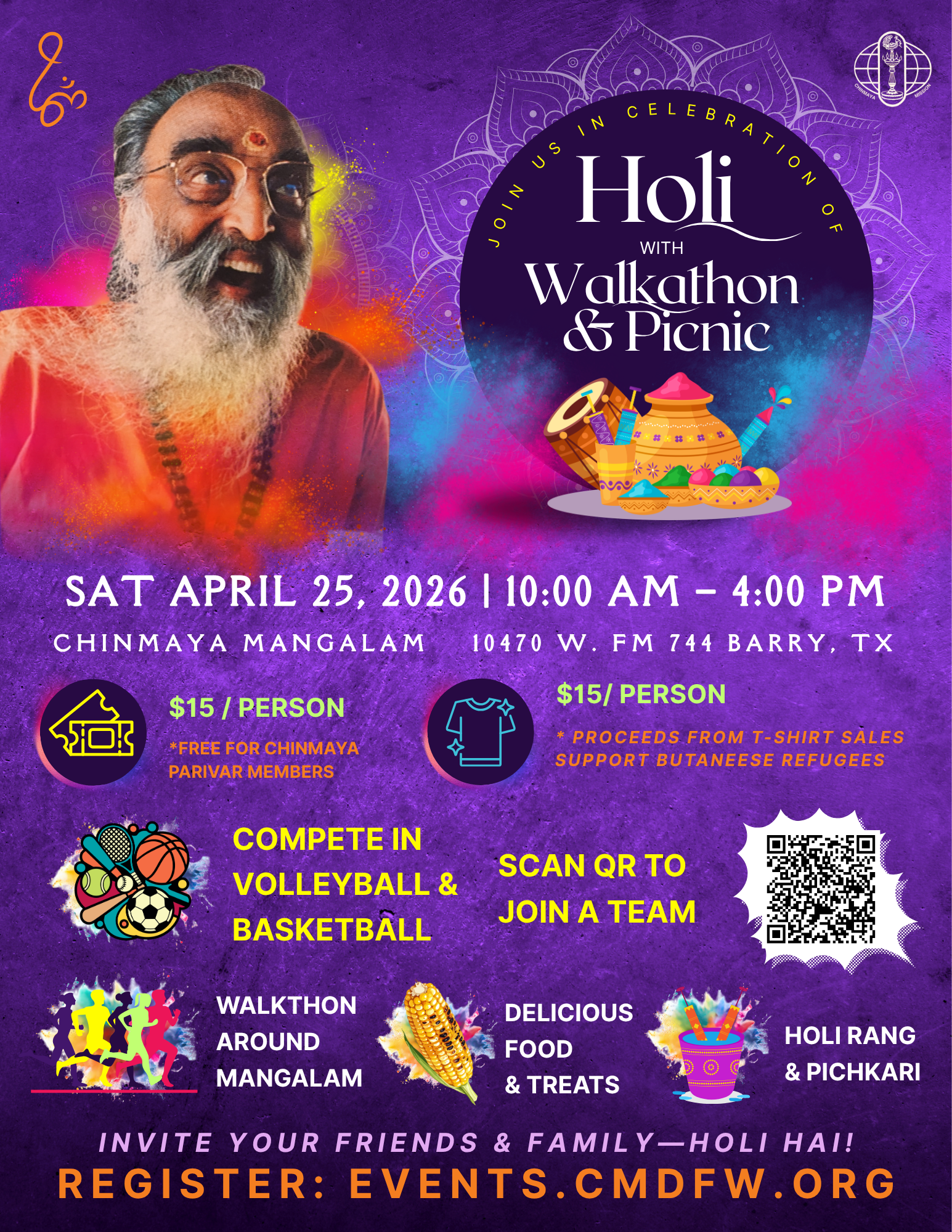 Registration for the walkathon/picnic event is $15/person and is free for Chinmaya Parivar family members.